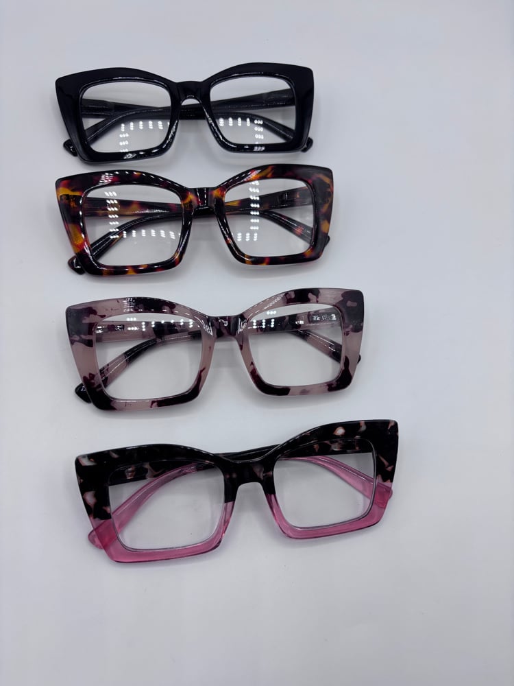 Thick plastic cateye eyeglasses. Can also be transitioned into clear lens.